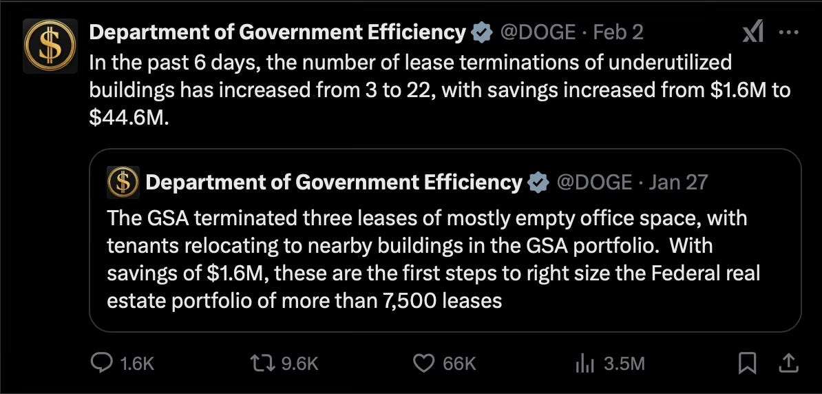 Already making moves, DOGE tweeted on Sunday, Feb 2, that it has saved $44.6 million by terminating 22 leases—and this is just the beginning.
